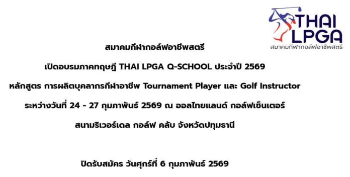 สมาคมกีฬากอล์ฟอาชีพสตรี เปิดอบรมภาคทฤษฎี THAI LPGA Q-SCHOOL ประจำปี 2569 หลักสูตร การผลิตบุคลากรกีฬาอาชีพ Tournament Player และ Golf Instructor ระหว่างวันที่ 24 – 27 กุมภาพันธ์ 2569 ณ ออลไทยแลนด์ กอล์ฟเซ็นเตอร์ สนามริเวอร์เดล กอล์ฟ คลับ จังหวัดปทุมธานี
