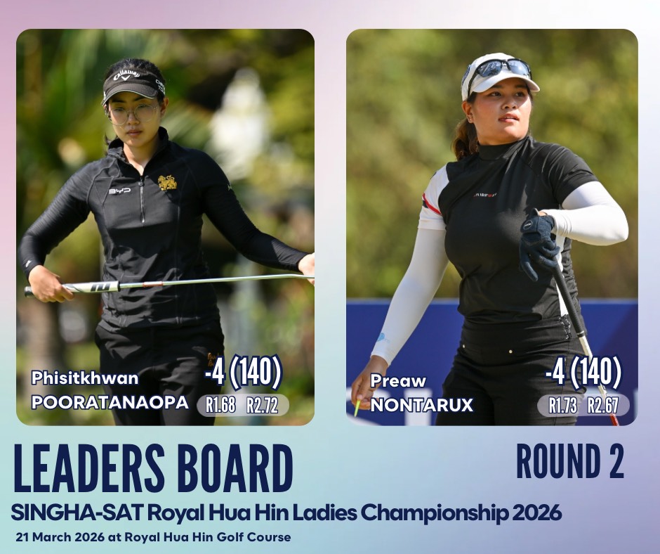 พิสิฐขวัญ ภู่รัตนโอภา ผู้นำรอบแรกจากนครศรีธรรมราช และแพรว นนทรักส์ โปรสาวจากลำปาง ขึ้นนำร่วมรอบสองที่ 4 อันเดอร์พาร์ 140 จากการแข่งขันกอล์ฟอาชีพสตรี ไทยแอลพีจีเอ ทัวร์ 2026 แมทช์เปิดฤดูกาล“สิงห์-เอสเอที รอยัล หัวหิน เลดีส์ แชมเปียนชิพ”ชิงเงินรางวัล 1.5 ล้านบาท ณ สนามกอล์ฟหลวงหัวหิน พาร์ 72 ระยะ 6,346 หลา จ.ประจวบคีรีขันธ์ เมื่อวันที่ 21 มีนาคม 2569
