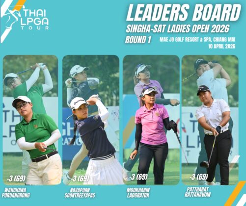 วันชนา โพธิ์เรืองรอง,นวพร สุนทรียภาส,มุขรินทร์ ลาดกระโทก และภัทรรัตน์ รัตนวรรณ สี่โปรสาวประเดิมขึ้นนำร่วมรอบแรกที่คนละ 3 อันเดอร์พาร์ 69 จากการแข่งขัน “สิงห์-เอสเอที เลดีส์ โอเพ่น 2026” ชิงเงินรางวัล 2 ล้านบาท ณ สนามแม่โจ้ กอล์ฟ รีสอร์ท แอนด์ สปา พาร์ 72 ระยะ 6,397 หลา จ.เชียงใหม่ เมื่อวันที่ 10 เมษายน 2569